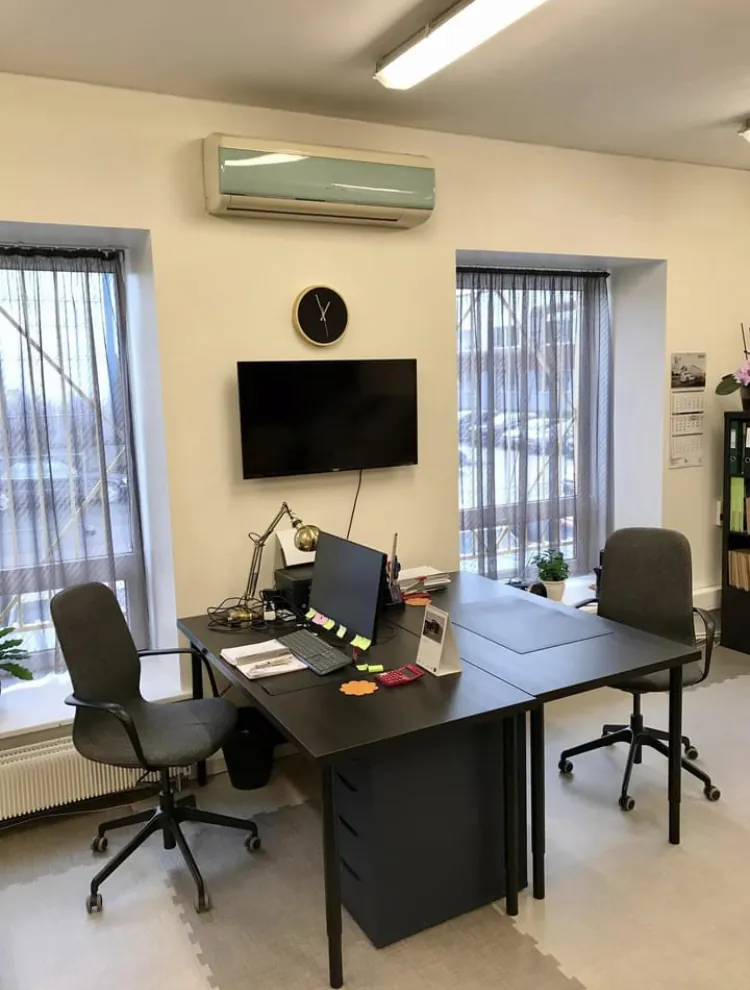 Valisime kahe akna vahelise seina, kus paiknevad konditsioneer ning telekas. Eesmärk oli muuta ruum veidi hubasemaks ning samas presenteerida ka materjali.